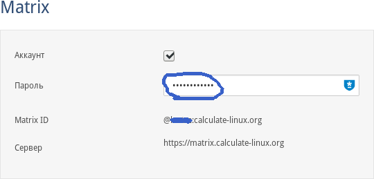 Matrix представляет собой федеративную сеть. Вы можете настроить свой собственный сервер, либо зарегистрироваться в любым другом сервере, предоставляющем такую услугу - например, на calculate-linux.org. Для регистрации в сети зайдите на сайт под своим логином и паролем и перейдите в свой профиль. В разделе Matrix поставьте галочку напротив "Аккаунт" и введите пароль: